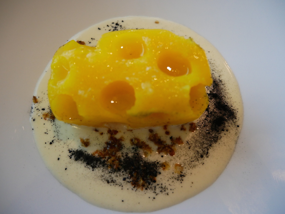 Fanti ci racconta che questo piatto gli appartiene moltissimo, poiché s’ispira alla sua infanzia a Firenze, quando con la sua famiglia era solito mangiare gli gnudi di ricotta, i porcini e i classici crostini con i fegatelli di pollo della tradizione toscana. In questo delizioso piatto gli gnudi diventano degli squisiti cubotti di ricotta, dalla crosticina croccante e il cuore cremoso, turriti con un saporitissimo patè di fegatini alla cannella e un “nonnulla” di yuzu, che arriva solo per sgrassare la bocca senza interferire, sul fondo una travolgente salsa di porcini corona il tutto. Squisito.