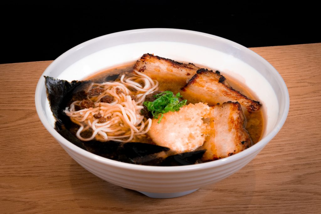 Il piatto principale del selezionato menu è il Tonkotsu, varietà di ramen diffusa a Fukuoka, città sull’isola giapponese di Kyushu famosa per i suoi numerosi allevamenti di maiali. Questo ramen ha la particolarità di avere un brodo di ossa di maiale e di gallina, molto denso e saporito che cuoce circa 18 ore e viene accompagnato con dei noodles molto fini e un uovo marinato.