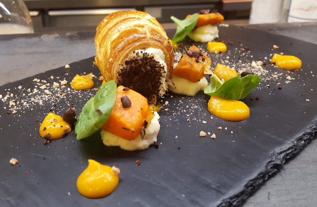 Ad aprire le danze è stato chef Pecere con il suo cannolo di pasta sfoglia ripieno di baccalà mantecato con zucca in doppia consistenza e provenienza ispirato al film Ricomincio da Tre del grande Massimo Troisi. Ad accompagnare il piatto, l’azzeccatissimo drink di Silvia Carpene (ispirato al film Un tè con Mussolini).