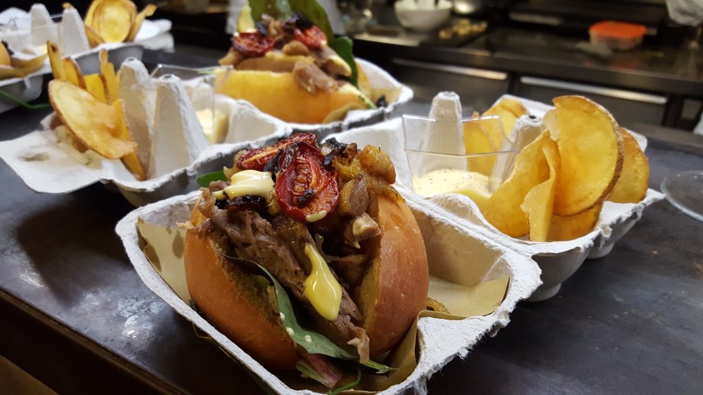 Fraioli ha invece giocato in casa con un classico della sua cucina: il maritozzo ripieno di anatra con pelle rosticciata, maionese home made all’arancia, pomodori confit e prugne sbriciolate. Una vera golosità servita all’interno della confezione delle uova. Film d’ispirazione? Babe il Maialino Coraggioso.