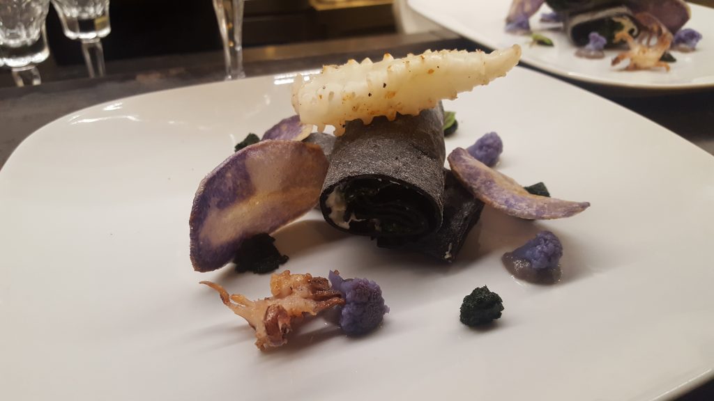 Terzo e ultimo piatto in gara quello dello chef Bergomi: seppia arrosto su crepes al nero ripiena di burrata affumicata cavolo riccio e cavolfiore viola. Bello come un quadro d’autore ed ispirato al film Chef.