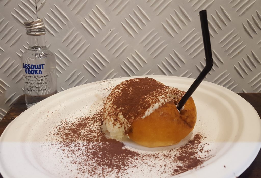 Fuori concorso, ma degno finale di serata, il maritozzo, bagnato al liquore al caffè, ripieno di panna montata e servito con vodka Like a White Russian dedicato al film Il Grande Lebowsky.