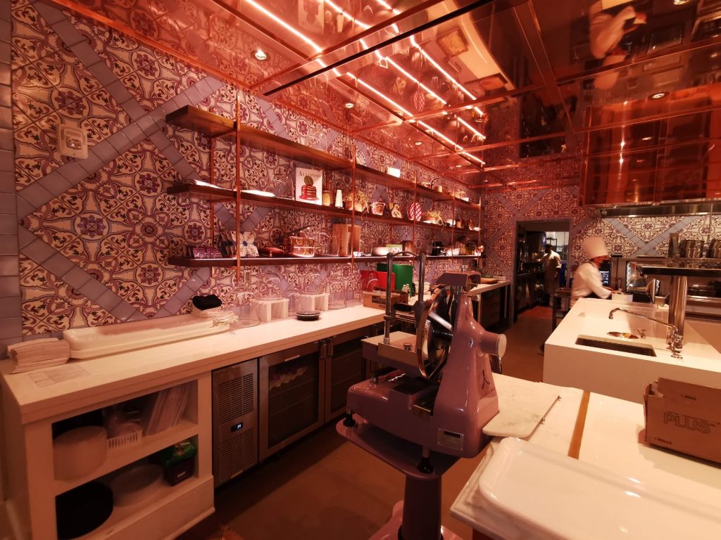 L’ispirazione nasce dall’idea di perseguire quello stile proprio delle antiche case napoletane nobiliari con le maioliche in cucina e le pentole di rame ma anche dalle tipiche “domus” pompeiane, antesignane della cucina a vista che abbiamo inserito nel locale, impreziosito da ampi arazzi e dove non poteva mancare il classico forno delle pizze, emblema della napoletanità nel mondo.