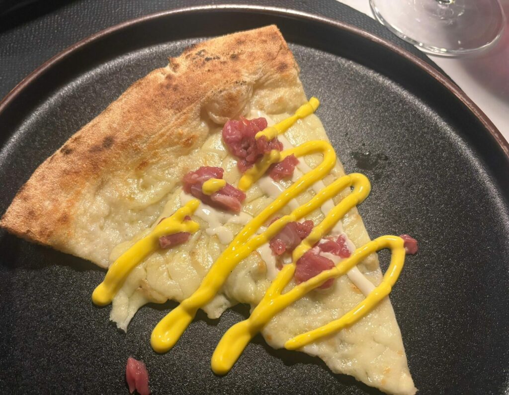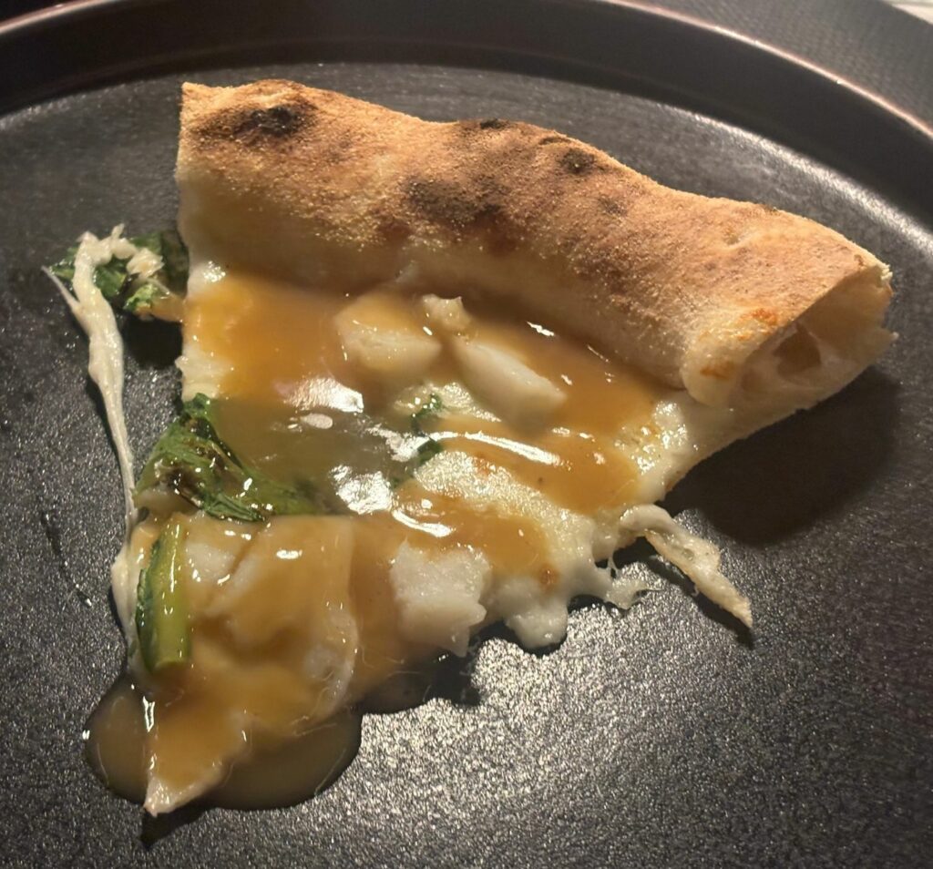 Nonostante le modifiche apportate in occasione di questa serata speciale, le pizze proposte sono tutte presenti in menù e possono essere gustate con diversi impasti a scelta in base alle preferenze personali. In particolare la Contemporanea, con impasto di tipo 0/1 a metodo indiretto, fior di latte, baccalà, lattuga e salsa alla cacciatora. La proposta Cereali, con selezione di semi e metodo diretto, ha esaltato salsa di pomodoro giallo, gambero rosso, ricotta salata e limone arrosto e la Con la Ruota di carro, impasto 0/1 a metodo diretto, tartare di agnello, provola di Agerola e majo allo zafferano.