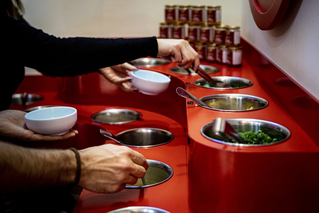 Sulla parete della sala principale, infatti, è disegnata una vera e propria ruota della piccantezza: si parte dai 12° fino ad arrivare ai 75°, chiamati anche “bomb spicy”, per un totale di sei livelli di intensità (noi consigliamo il 45°). Ovviamente si può optare per un brodo senza peperoncino (quello con pomodoro e funghi porcini è ideale da bere prima di iniziare il pasto).