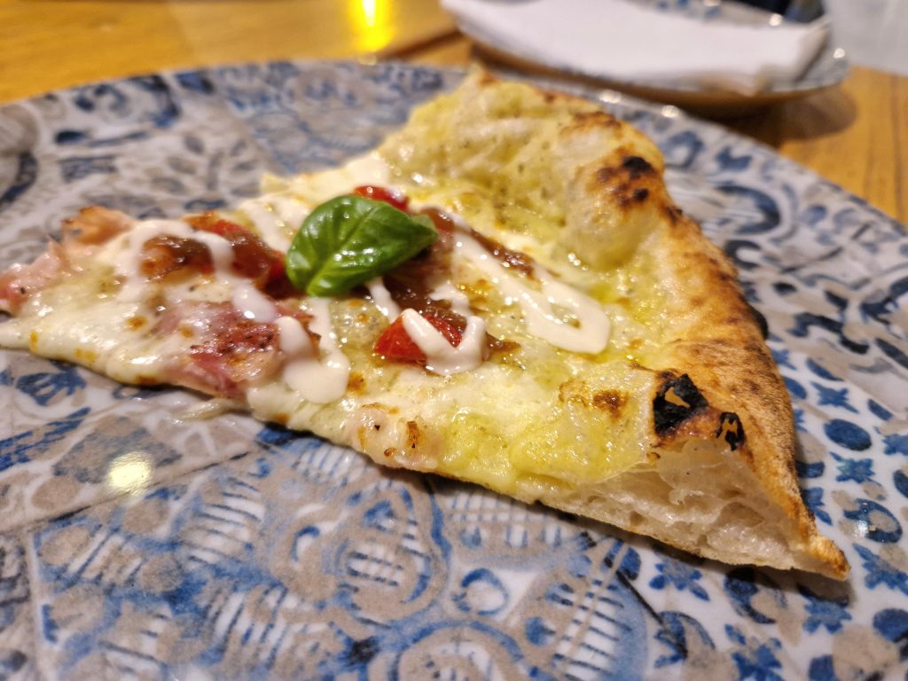 Insomma, il vecchio e il nuovo coniugati in un 3.0 di pizze interessanti e ben raccontate. Ambiente moderno, insonorizzato con cura per gestire la forte affluenza in pizzeria: consigliamo di prenotare. Antonio ci racconta di come si siano ampliati negli anni e di come abbiano deciso, oggi, di voltare pagina, impostando il navigatore sulla qualità a tutti i costi. Buona e fatta bene, la pizza di Diametro 3.0 è cambiata, leggerissima, elastica, con un cornicione arioso, tutto da mordere. Idratazione importante, ma giusta per un forno a legna che ben asciuga la pasta, schiudendo fragranza.