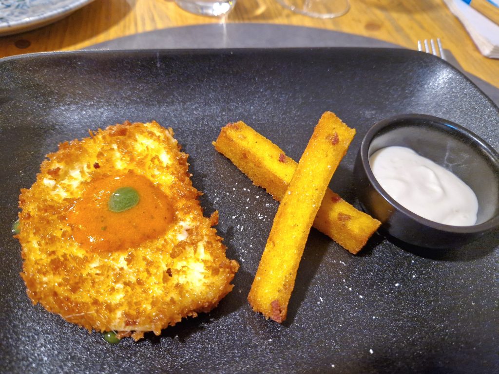 Equilibri che fanno la differenza tra improvvisazione – vedi alla voce “mettiamo un’infinità di ingredienti così prendiamo like su instragram” – e una vis focalizzata sulla ricerca. Si parte con i fritti, nel nostro caso, Provola in crosta di pane panko, e Scagliozzi (polenta fritta) con fonduta di Taleggio. Dorati, stuzicanti, anticipatori dell’attenzione per il cibo confortante.