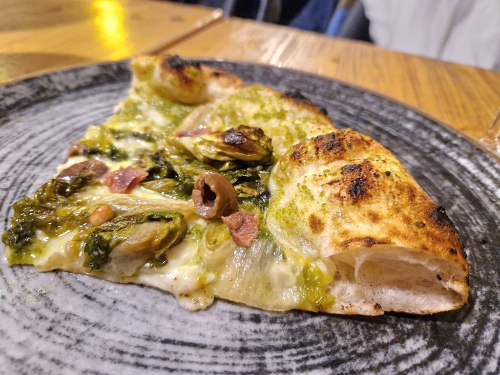 Margherita, il grande classico e poi Scarola in doppia consistenza, quindi crema di scarola e scarola saltata con pinoli, capperi e olive. C’è anche la provola e, dopo la cottura, alici del Cantabrico. Proseguiamo con la pizza Sottobosco: porcini, fior di latte di Agerola, blu di bufala e castagne al forno. Terminiamo con Oro Dolce: crema di patate al rosmarino, fior di latte di Agerola, cipolla caramellata al whisky, pancetta al miele, pomodorini semi-dry, pepe e fonduta di Grana Padano 16 mesi.