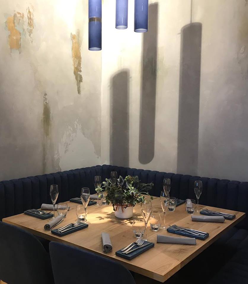 L’illuminazione di design, caratterizzata da lampadari in ottone modellato a forma di rete da pesca, rendono l’ambiente intimo e raffinato, ideale per un aperitivo o una cena romantica. Splendido il bancone bar, realizzato in ceramica blu e posto al centro della sala.