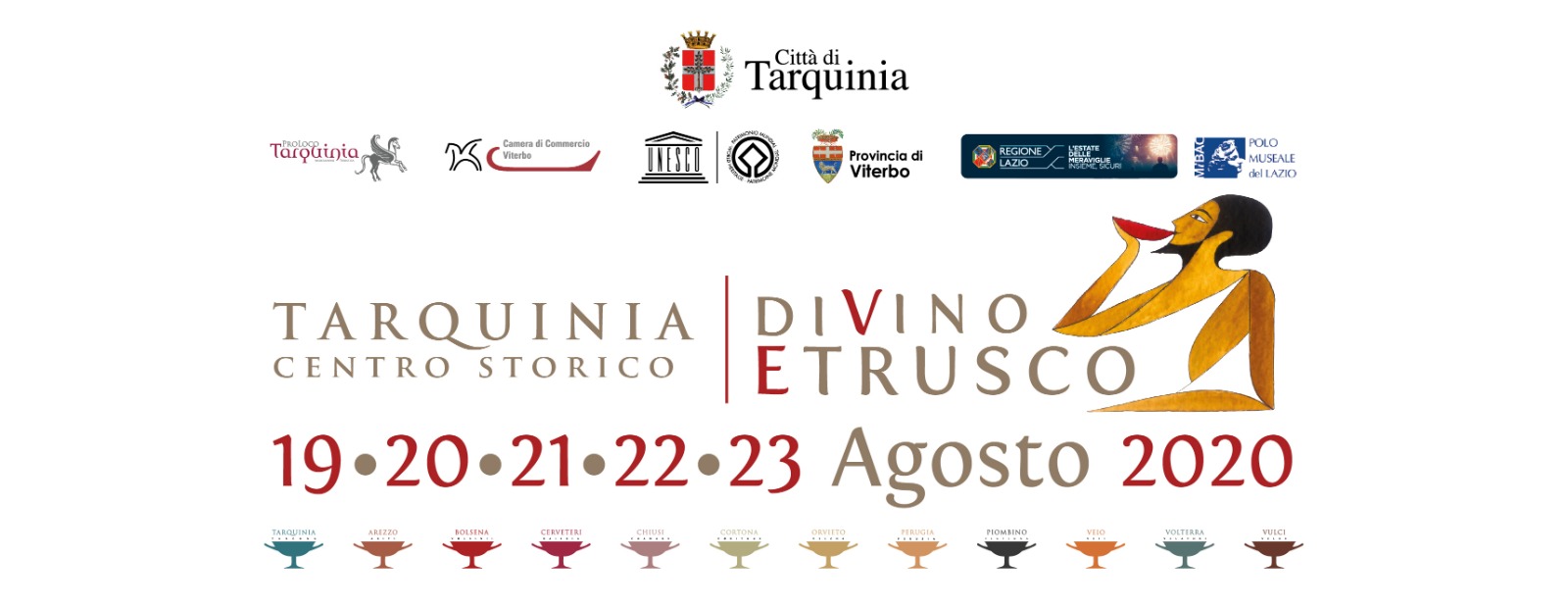 L’edizione 2020 di “Divino Etrusco”, inserita nell’ambito di “Lazio delle Meraviglie” della Regione Lazio, torna ad illuminare il centro storico di Tarquinia, splendida città etrusca, concentrato di Arte e Archeologia, dal 19 al 23 agosto.