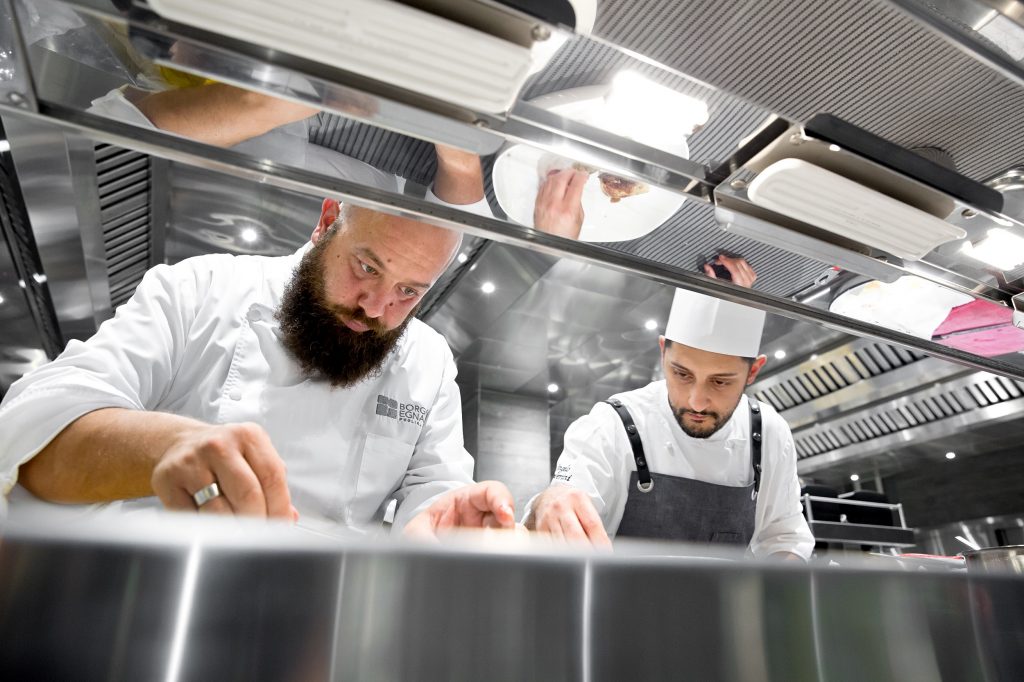 La ricerca dei fornitori per la selezione della materia prima è fatta con molta attenzione, i produttori Domingo li va a conoscere di persona, uno a uno. Gli ortaggi arrivano dagli orti del Borgo, la produzione interna garantisce l’autosufficienza per tutto l’anno, mancano solo i frutteti. Mai dire mai. Nella scelta delle carni Domingo preferisce le vacche adulte, il sapore è migliore, la grassezza è diversa. Sono meno richieste perché la frollatura richiede più giorni, lui ne impiega sessanta nelle celle create appositamente. Le ricette rincorrono le stagioni e i gusti rincorrono le armonie e i contrasti. Un nuovo piatto nasce secondo lo stato d’animo del momento, l’ispirazione può arrivare dall’esperienza personale, da un viaggio, da una qualunque cosa.