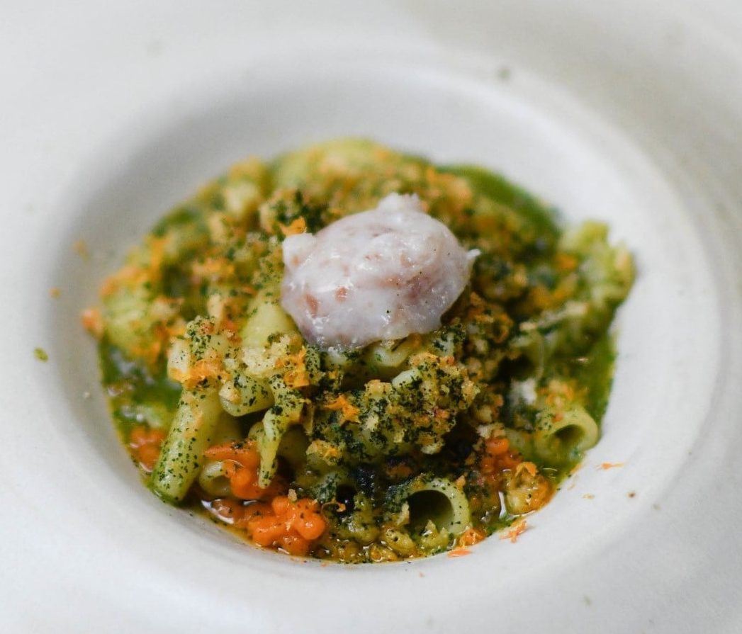 L’ultima batteria ha invece visto trionfare una donna, Sara Scarsella del ristorante Sintesi ad Ariccia, con un piatto di tubetti rigati affumicati, sedano rapa e nasturzio; dumpling di maiale, sedano fermentato e brodo di