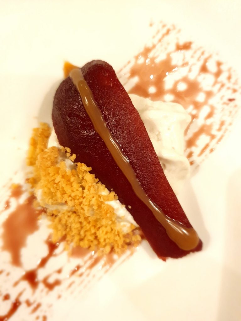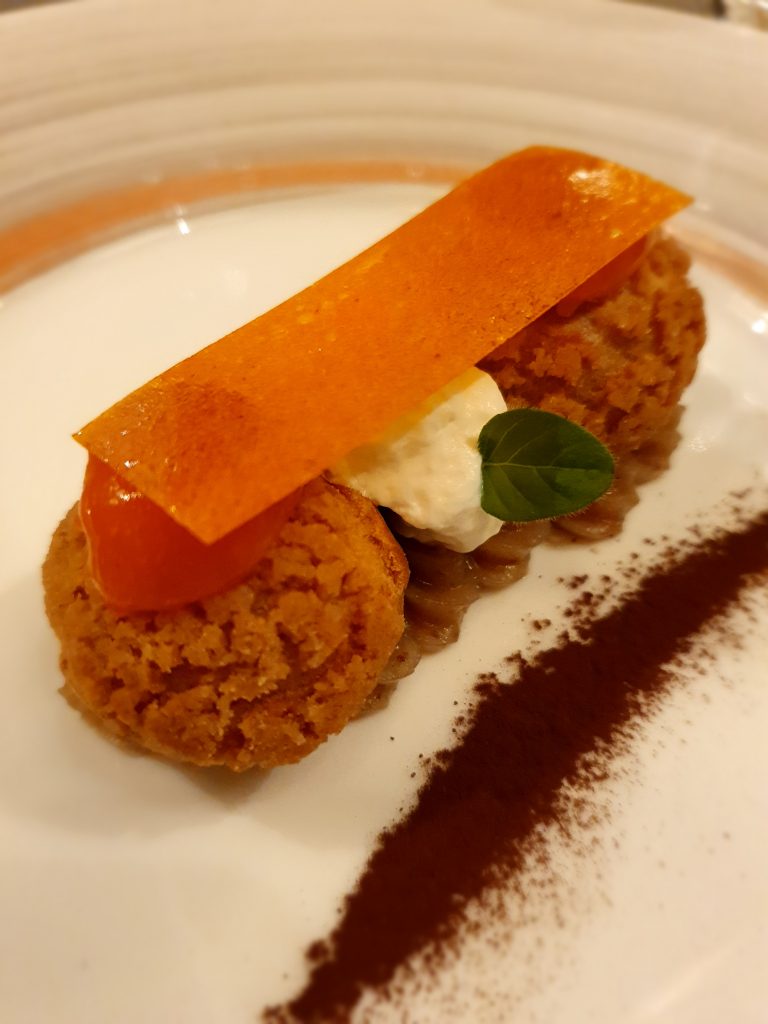 Chiudono in dolcezza i dessert come il Cachi e Castagne, un bignè ripieno di crema di castagne con gel di cachi e panna al rosmarino. O ancora il Al contadino non far sapere a base di pera cotta nel Roma DOC servita con una crème fraiche e gelato di gorgonzola. Un perfetto bilanciamento di dolcezza e sapidità, cremosità e croccantezza.