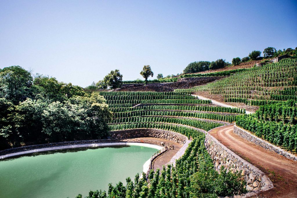 La superficie vitata si estende complessivamente per circa quattro ettari e mezzo. Il nucleo principale di tre ettari si trova in contrada Arrigo, nelle immediate vicinanze del resort e dell’agriturismo. È costituito da vigneti di 30-60 anni di Carricante, Catarratto e Nerello Mascalese. A questi si aggiungono nuovi impianti delle stesse varietà con leggera prevalenza di uve a bacca bianca. In località Borrigliona, sempre a Linguaglossa, è ubicato un altro ettaro e mezzo. Qui si coltivano vigneti di Nerello Mascalese e Nerello Cappuccio di oltre 70 anni di età. I sistemi d’impianto utilizzati sono sia la spalliera che l’alberello etneo sostenuto dal palo di castagno.