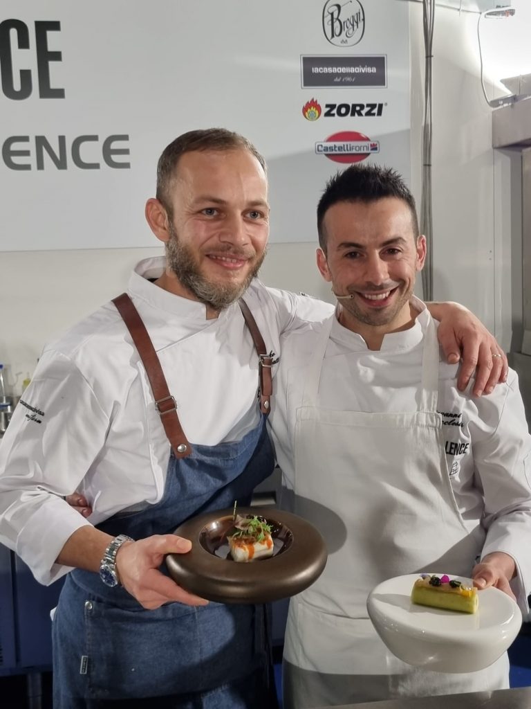 Tra i quattro mani che hanno entusiasmato il pubblico anche quello tra Dino De Bellis e Fundim Gjepali con la rivisitazione del classico della cucina romana agnello e puntarelle, e quello tra Mirko Di Mattia e Giuseppe D’Ecclesiis che hanno realizzato rispettivamente baccalà in salsa mugnaia, nduja e pane ai capperi e baccalà mantecato con sfoglia di porro, pompelmo e caviale.