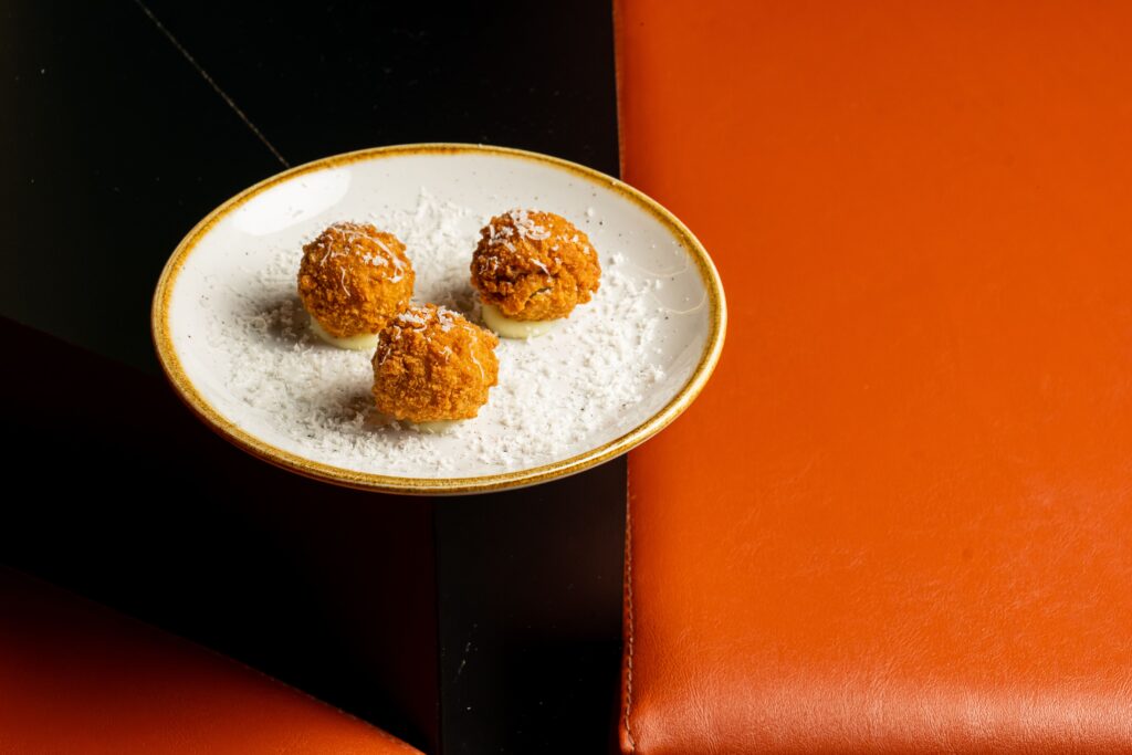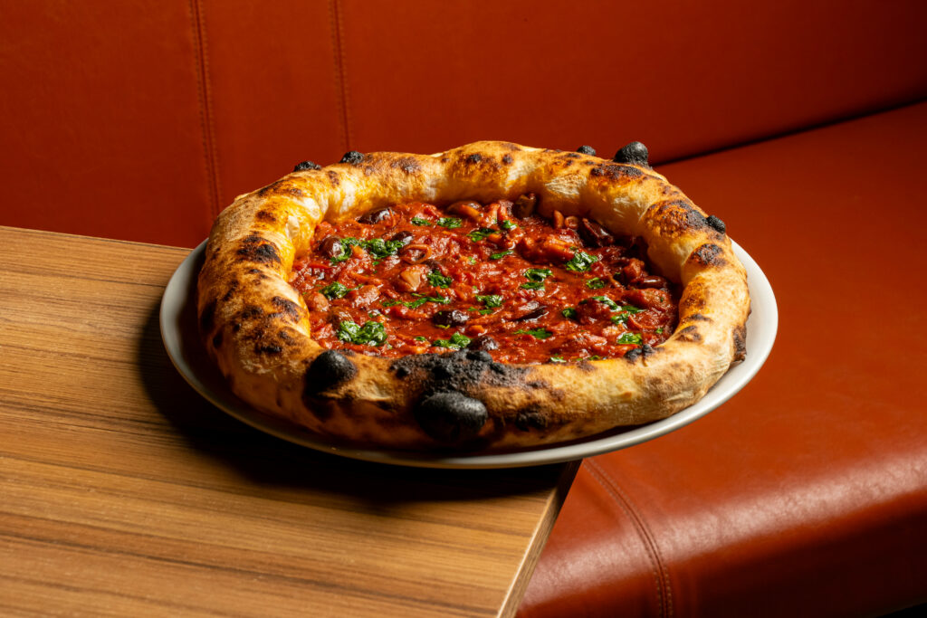 La forza di Fermento risiede nella combinazione unica di ingredienti e tecnica: una pizza realizzata esclusivamente con farine di media forza, farina di soia tostata e farina di farro, cotta a gas per ottenere una crosta leggera e asciutta. L’impasto, in controtendenza, è un impasto diretto a doppia idratazione (circa 80%), frutto di un blend esclusivo sviluppato da Federico Visinoni in collaborazione con Molino Petra, che a breve lancerà un progetto dedicato alla produzione di grano locale ad Aprilia. L’olio extravergine è l’836 di Terrasalva, realtà apriliana con cui Visinoni collabora fin dall’inizio, mentre i formaggi provengono dal Caseificio Sorì.