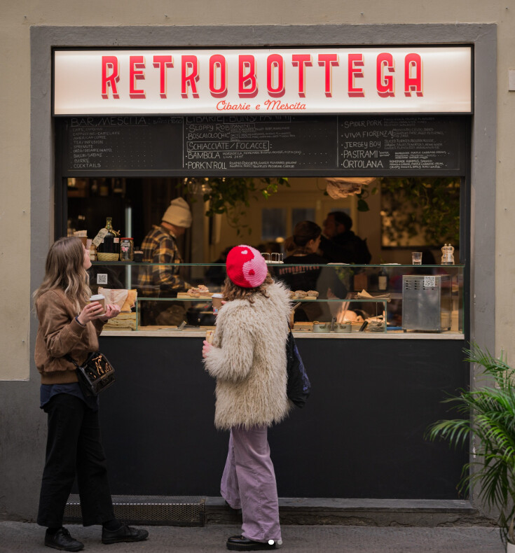 Retrobottega, tra la Casa di Dante e gli Uffizi, è un locale piccolissimo che ha l’ingresso con una finestrella dove si può prendere il panino da portar via. Oppure si entra e ci si accomoda nell’ambiente interno. Roberto, chef e ideatore del format, prepara ogni boccone immerso tra formaggi del territorio, verdure fatte in casa, salumi di livello e specialità regionali. Il concept è street food di qualità. Lo Sloppy Rob è il cavallo di battaglia: manzo sfilacciato aromatizzato al vino rosso, cipolle, spezie, senape al miele. Anche il Pastrami, nella versione invernale con crema di cavolo viola, pecorino e maionese allo zenzero, merita l’assaggio, insieme alle opzioni vegetariane.