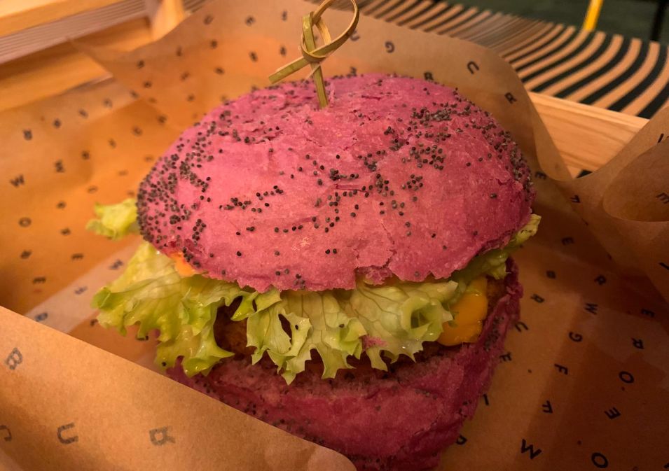 Il menù è molto vario: si passa dal pane giallo fatto con la curcuma, al nero del carbone, fino al rosa, ottenuto grazie all’estratto di ciliegia. Gli ingredienti selezionati sono tutti italiani e sia il pane che le salse e i burger vegetali vengono prodotti da loro.