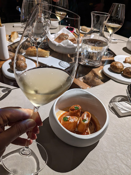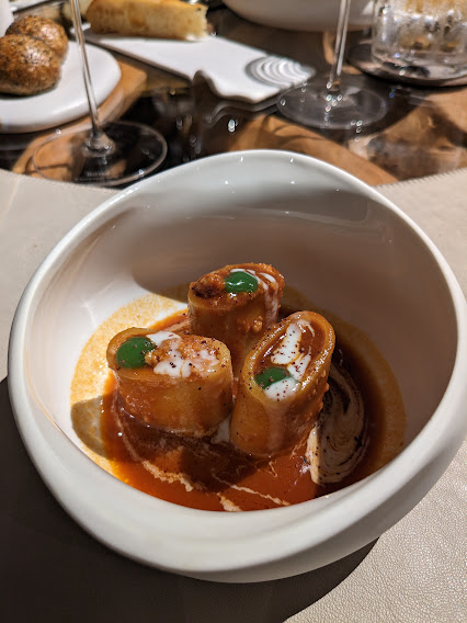Arriva quello che a buon titolo può essere considerato il piatto più suadente, il perfetto connubio tra mare e terra, tra tradizione e contemporaneità. Mi riferisco al carciofo cotto in 2 modi: alla romana e poi fritto sulle punte, con un ripieno di coratella di tonno, tuorlo marinato con soia myso e rifinito con tartufo nero, su base di fonduta di caciocavallo. Un piatto sontuoso e avvolgente.  Equilibrato, nonostante la complessità degli abbinamenti, sorprende ad ogni morso grazie al rincorrersi delle consistenze. Irrinunciabilmente godurioso. Sorpresa ancora più grande trovare il perfetto abbinamento tra questo carciofo e un calice di Gewurtztraminer les Prince abbes Domaines Schulemberger 2020. Un vino alsaziano intensamente profumato.