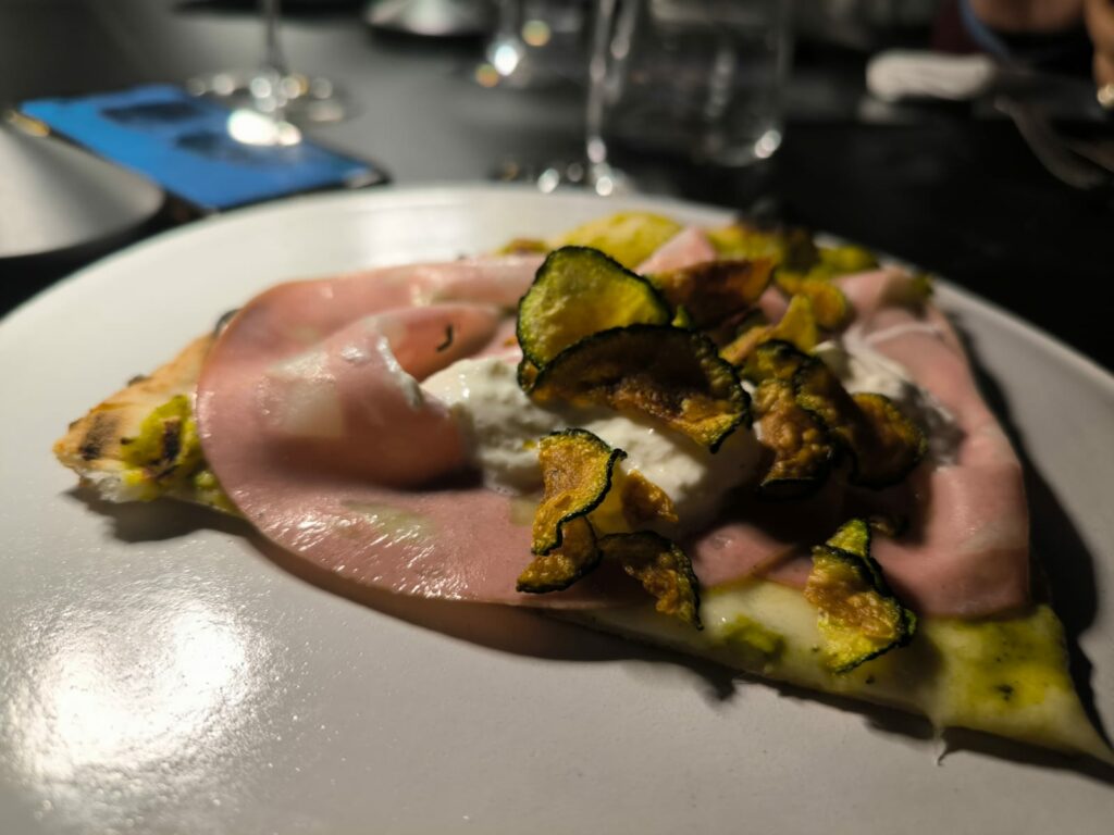 La Bologna con vellutata di zucchine, fiordilatte di Gragnano metodo artigianale, mortadella, stracciatella, chips di zucchine e olio EVO Leccino BIO; il Rustico Palermitano con Pomodoro San Marzano DOP, fiordilatte d i Gragnano metodo artigianale, filetti di alici di Cetara, pomodorino confit, cipolla di Tropea caramellata, caciocavallo di Piana Degli Albanesi, mollica di pane fresco, origano e olio EVO Leccino BIO. Tra i dessert interessante il sorbetto al limone rigorosamente artigianale e, per i più golosi, il parfait di mandorle e la panna cotta al caramello salato.