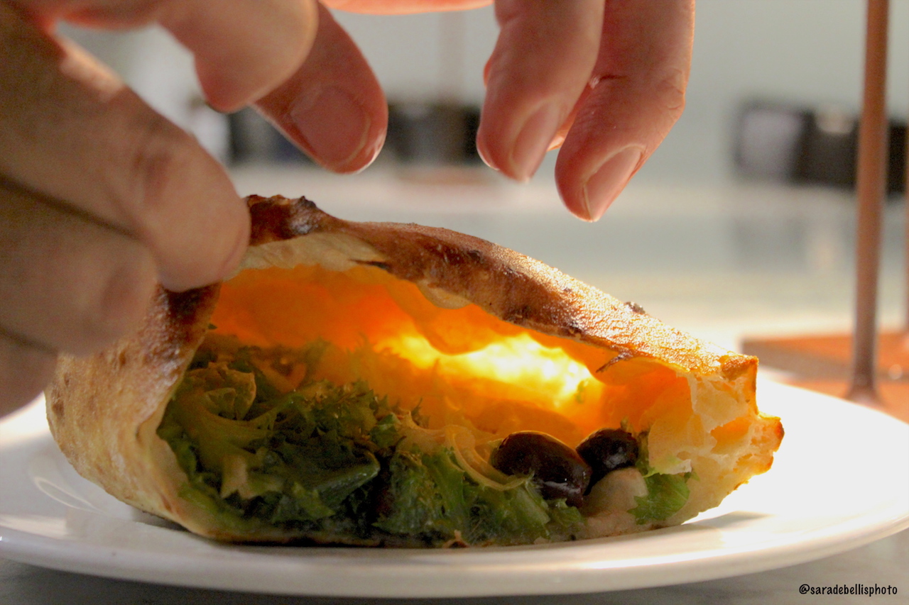 E’ domenica. Piove. Sono le 16. Mentre scendo i gradini, scivolando, mi faccio largo tra un fiume di persone che, come salmoni controcorrente, continuano a risalire piano verso il Corso principale. Varco la soglia . Franco Pepe è impegnato a discutere di nuovi progetti sostenibili. Instancabile maestro artigiano, dopo avermi abbracciato, mi invita a sedermi a tavola; mi porta un “calzone alla scarola” fumante, mi versa l’acqua, la conversazione prende un altro ritmo: computer e macchina fotografica ora sono spenti; come lui ha deciso. Quei segnali per me sono chiari. Esplicitano una voglia di umanità, un racconto conviviale dell’uomo prima ancora del Maestro Pizzaiolo.