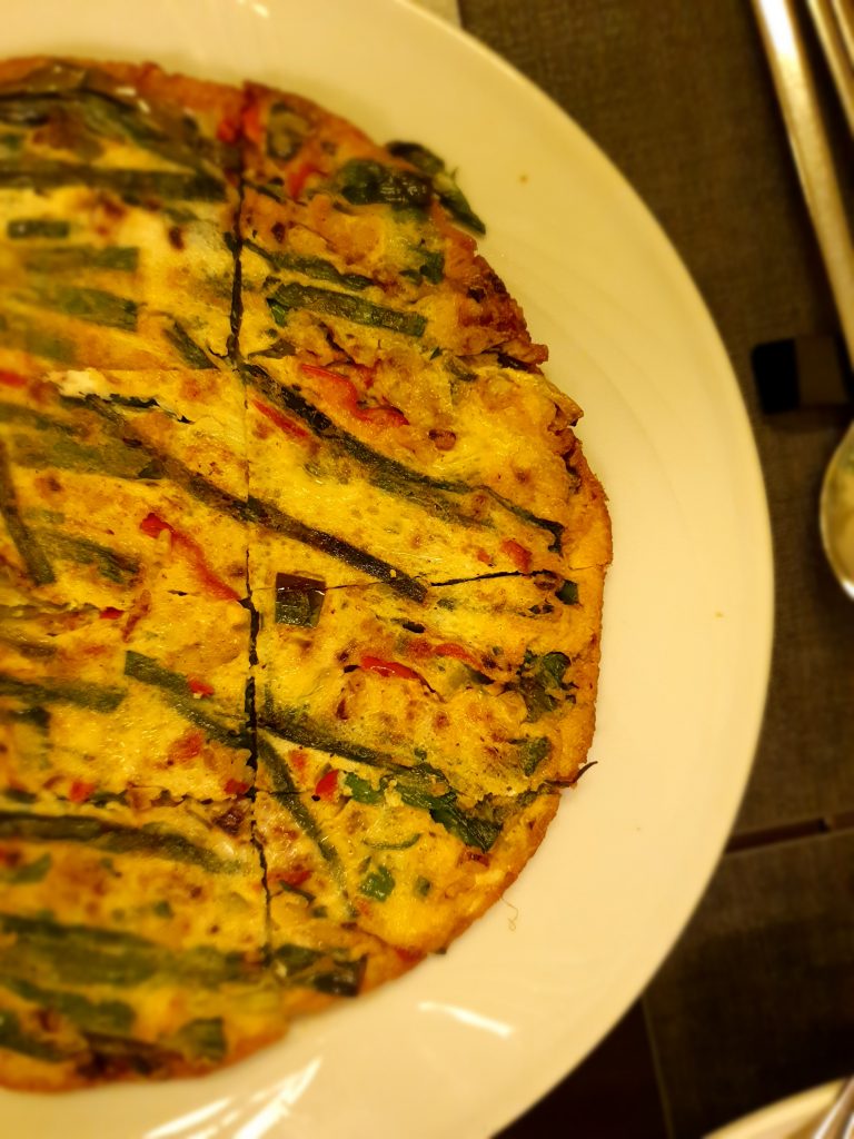 Haemul Pajeon è una frittata con frutti di mare, uova e cipollotti freschi davvero gustosa, perfetta da dividere con i commensali per iniziare il pasto.