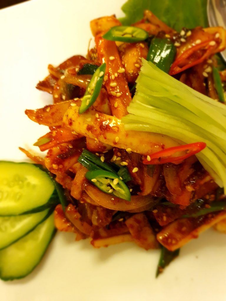 Ottimo lo Yangnyeom Chicken: pollo fritto in salsa agro piccante con spolverata di arachidi. Un sapore davvero avvolgente così come quello dei Ojingeo Bokkeum cioè calamari con verdure miste saltati in padella con salsa piccante.