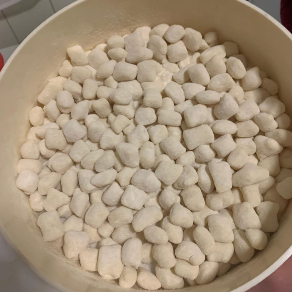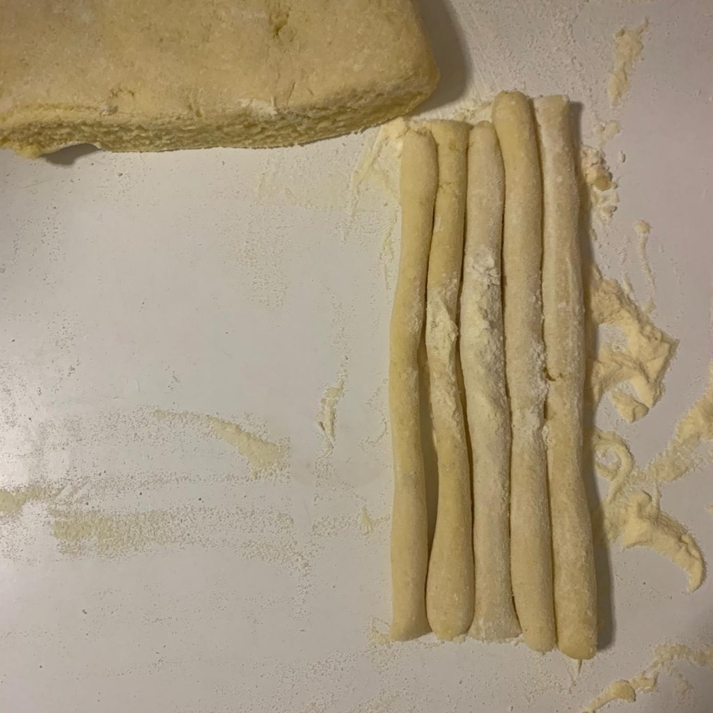 Fate riposare l’impasto in frigo per 25\30 minuti. Una volta riposato, prendete un pezzo d’impasto per volta e stendetelo con la punta delle dita per formare dei filoncini della grandezza di 2,5 cm. Tagliate i filoncini in modo da ricavare tanti cubetti.