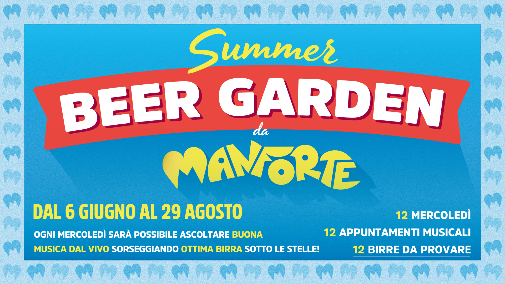 Il 6 giugno Manforte, il locale romano in zona Talenti (ve ne avevamo parlato qui) inaugura la stagione estiva con l’apertura del Summer Beer Garden. Ogni mercoledì fino al 29 agosto, il giardino diventerà il palcoscenico di dodici appuntamenti in cui birra, cibo e musica saranno le protagoniste indiscusse tra ghirlande di luci, grandi tavolate e musica dal vivo.La kermesse inizierà il 6 giugno con la degustazione delle birre di EastSide brewing e l’accompagnamento musicale di Ancora Tu, la band omaggio a Lucio Battisti. Il secondo appuntamento, il 13 giugno, sarà la volta di Birra dell’Eremo e di Daltrocanto, un trio musicale che presenterà un viaggio nei ricordi a partire dagli anni 60 per riproporre con arrangiamenti semplici e raffinati la musica leggera. Il 20 giugno sarà invece ECB, Eternal City Brewing a far degustare le sue birre mentre il 27 giugno ci saranno le birre di CR/AK Brewery, il birrificio artigianale di Padova.