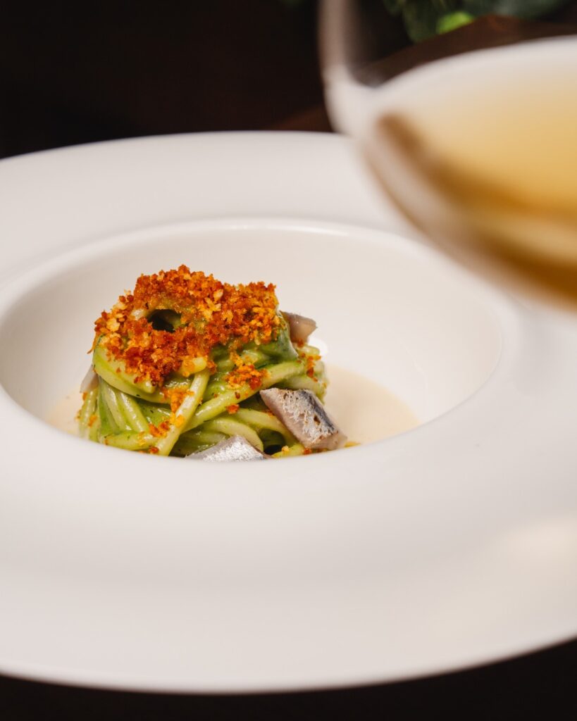 Altro passaggio emblematico di questo percorso è il “Tributo a Santa Lucia”, spaghettone con finocchietto, bottarga, alici e garum. Un piatto dal profilo mediterraneo intenso ma sorprendentemente equilibrato, in cui mare e terra dialogano con eleganza. Il finocchietto prepara il palato, lasciando emergere la sapidità burrosa delle alici e la nota iodata della bottarga, mentre il garum amplifica il tutto con una profondità umami che allunga il gusto e conquista.