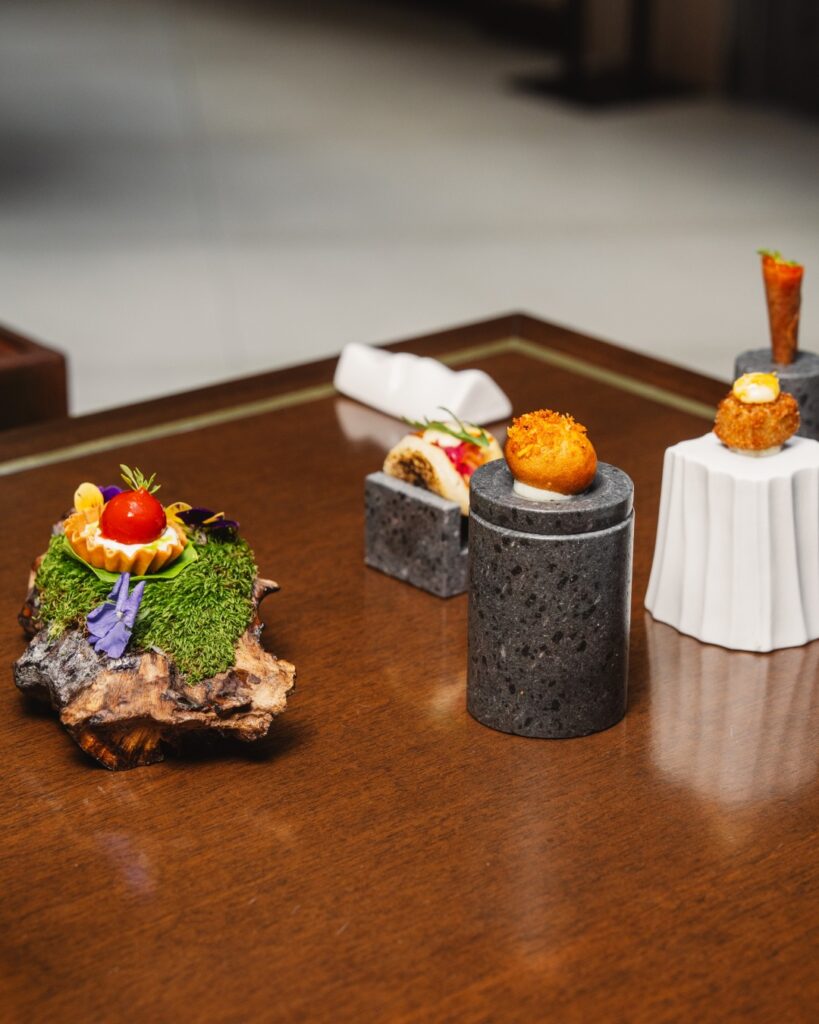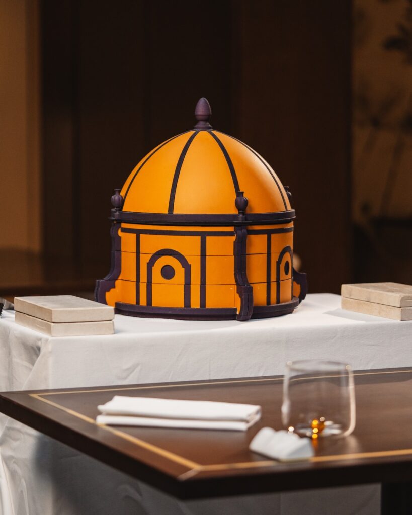 La cucina di Torrisi diventa traduzione culinaria del paesaggio. Lo dimostra l’antipasto “Ricciola e gambero rosso d’Ortigia”, in cui la dolcezza carnosa del pescato incontra la sapidità marina di un dashi alla bottarga, evocazione diretta del mare. Il tutto è bilanciato dalla freschezza del cacomela, dal finocchio che armonizza il piatto e da un tocco finale di mandarino verde, vaporizzato come un profumo, capace di illuminare ogni boccone.
