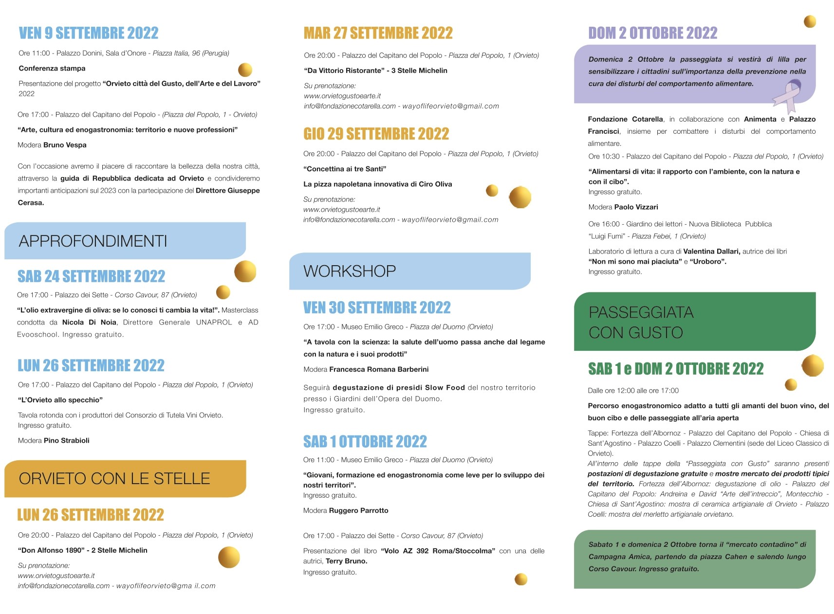 Raggiungibile da tutti, l’apice di questa edizione sarà il primo week end di ottobre (1-2 ottobre) che vedrà tre convegni e le passeggiate gastronomiche tra le vie e le piazze medievali della città per le quali si potranno gustare piatti tipici e vini del territorio e percepire il coinvolgimento proattivo dei giovani grazie all’importante collaborazione con l’istituto per l’istruzione superiore artistica, classica e professionale di Orvieto.