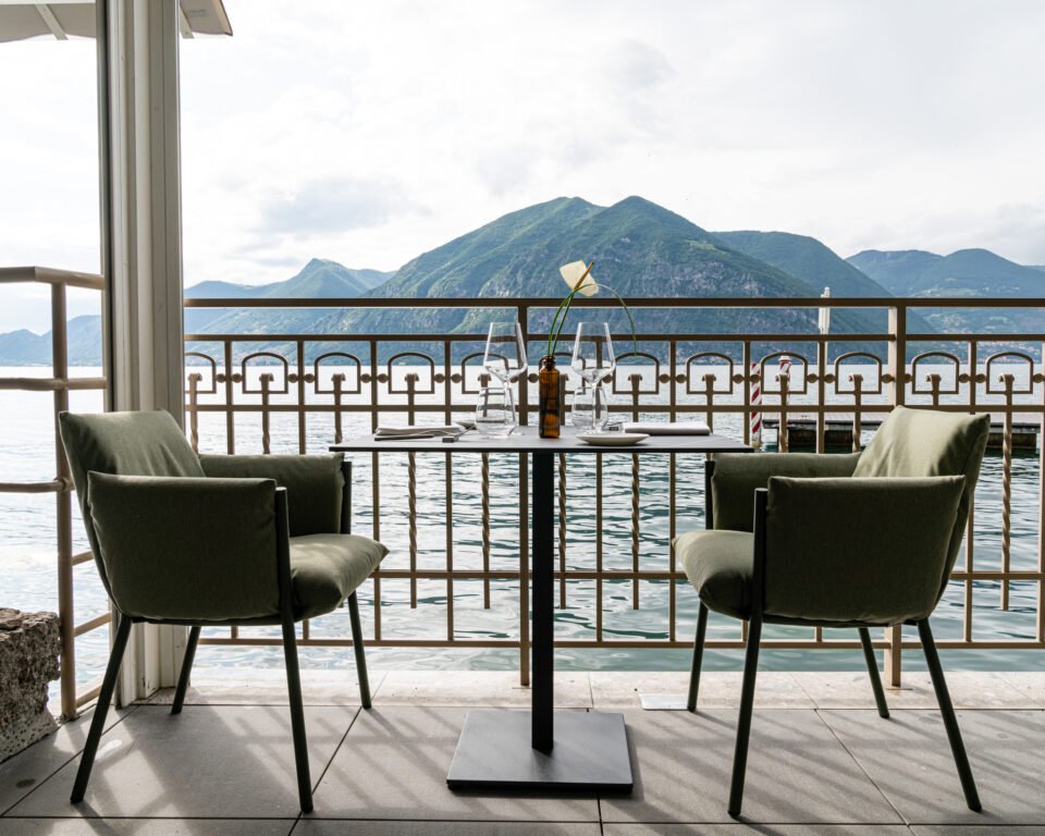 La sala interna, elegante e raffinata con luci soffuse e comode sedute in velluto color rubino e smeraldo, confina con una splendida terrazza a sfioro sul lago che permette agli ospiti di godere di indimenticabili tramonti durante la cena.
