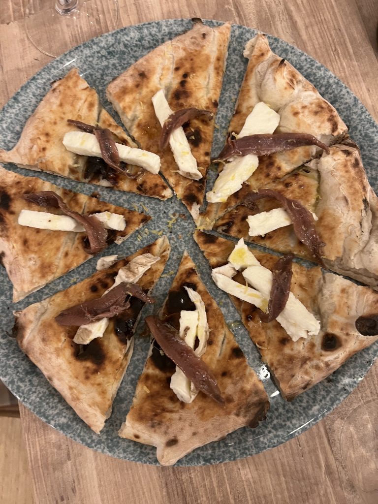 Ben equilibrata e con ingredienti di qualità, la Pizza con alici, provola di bufala fresca affumicata con paglia e fieno e scorzette di limone.