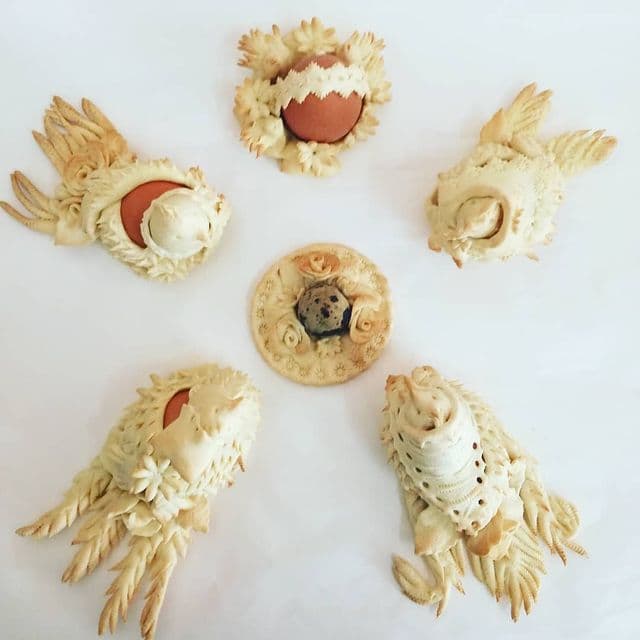 alcuni così rifiniti e curati che rendono il pane una vera opera d’arte. Per creare le rifiniture si usano apposite forbici, pinzette o rotelle taglia pasta (l’immancabile sarretta). Il pane viene infornato con l’uovo e in Gallura prende il nome di bibbilliu. Esiste anche una versione destinata ai più piccoli, ovvero sa pippia cun s’ou (trad. la bambina con l’uovo), un pane a forma di bambina che stringe a sé un uovo.