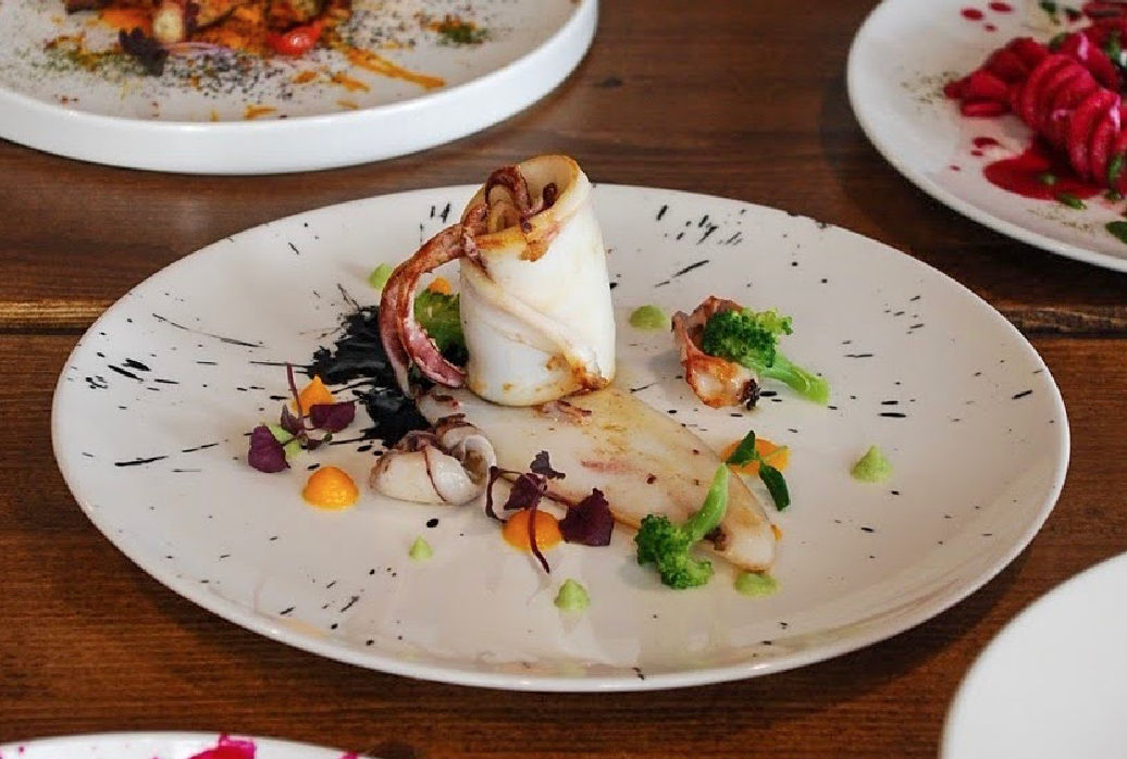 Una cucina creativa e fortemente mediterranea, un’attenta selezione di piccoli produttori e una forte attenzione a privilegiare l’allevamento italiano ed etico, una filiera pulita di approvvigionamento degli ingredienti della cucina. Tra le specialità, il Polpo tre cotture, vellutata di ceci,crumble di olive taggiasche, acciughe cantabriche e pomodorini confitati e i Paccheri di Gragnano cacio e pepe, carciofi e menta.