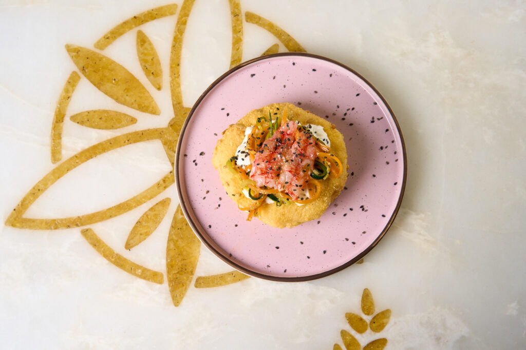Il menu è costruito come un viaggio. Si parte dagli antipasti, piccole creazioni che giocano con l’impasto in chiave diversa: c’è la montanara orientale, dove la tradizione partenopea incontra gamberi e salsa hoisin, o la tacos pizza, che trasforma la pizza fritta in un boccone street-food.