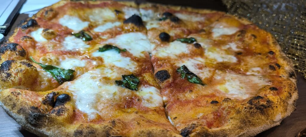 Nel ricco menu del locale troverete il Benvenuto del Pizzaiolo: una mini sfera fritta di impasto pizza, farcita con mozzarella di bufala DOP e crema artigianale al pistacchio, guarnita con julienne di mortadella Levoni e croccante al limone ( di cui esiste su richiesta anche un’opzione vegetariana). Tra le chicche anche la Margherita rivisitata ovvero pane pizza con fiordilatte Latteria Sorrentina, passata di pomodoro Rosso Siculo a lenta cottura, basilico fresco e olio evo biologico Terraliva. E ancora Sicilia Bedda, impasto classico, fiordilatte, filettino di pesce spada fritto, crema di melanzane, polvere d’arancia e caviale di menta e Striata un pane pizza in doppia cottura (frittura e forno), con filetto di triglia sfumato al vino bianco Cusumano, salsa bianca agli agrumi, nero di seppia e salsa acida di capperi e prezzemolo. Da provare Ad Maiora: impasto classico con fiordilatte, spuma di patate e burro, tartare di Angus marinata in salsa di soia, alga fritta, polvere di olive nere e riduzione al Nero d’Avola. Da non perdere, inoltre, due fuori menu che sono il must del locale: la ruota di carro e la classica con condimento a scelta.