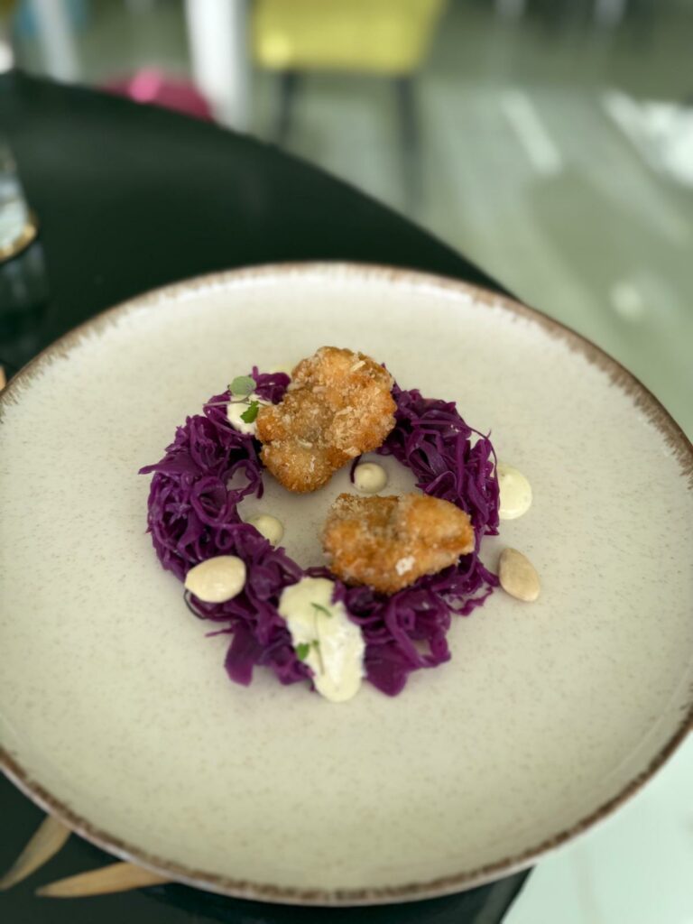 Il primo piatto del menu degustazione è “Coniglio”, fritto accompagnato da yogurt, cavolo rosso, aceto e mandorle, completato da una maionese. Un piatto che gioca su contrasti di consistenze e acidità, risultando equilibrato e piacevole ma soprattutto golosissimo. Segue “Capasanta” con champagne, caviale di storione, prezzemolo, tartufo nero e spugnola. Un piatto che unisce eleganza e territorio, dove il tartufo nero umbro dialoga con elementi più internazionali senza perdere identità, anzi.