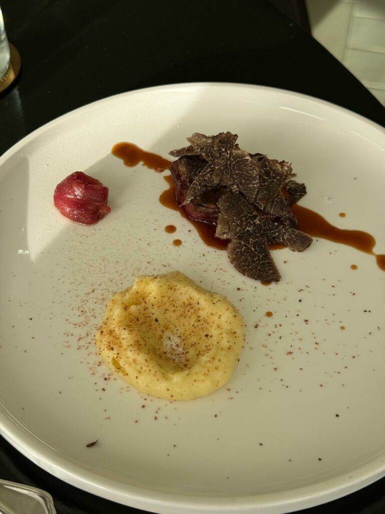 Il secondo piatto è il vero protagonista della degustazione: il piccione BBQ. Il petto è lasciato quasi crudo, mentre il resto della carne è cotto al sangue con grande precisione. Ad accompagnare, un purè tradizionale molto ben eseguito, scaglie di tartufo nero di Norcia, scamosciata e, serviti a parte in un piccolo contenitore di terracotta, fegatini al forno davvero interessanti. Un piatto completo, profondo, probabilmente il migliore dell’intera esperienza.