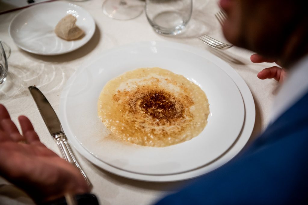 Altro segreto importante: il burro deve essere inserito a temperatura molto fredda con la proporzione 40 g su 100 g di burro (non abbiamo mai detto che il re del risotto non usasse una bella quantità di burro!) e mescolato con una frusta che permette di inglobare aria, rendendo il risotto cremoso senza l’aggiunta di ulteriore burro.