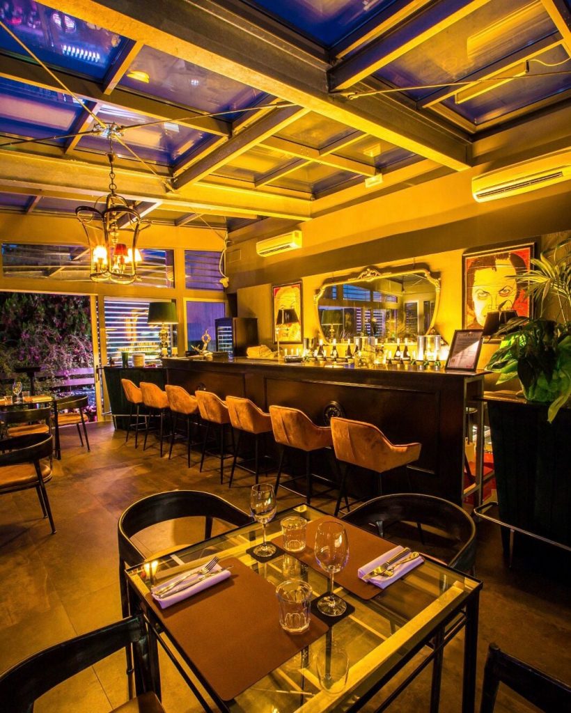 Il lunghissimo bancone del cocktail bar coi suoi sgabelli fiancheggia la sala sul lato destro, mentre bellissime piante tropicali, lampade di design e le ironiche opere pop dell’artista Nina.faceclub imprimono una decisa personalità all’ambiente.