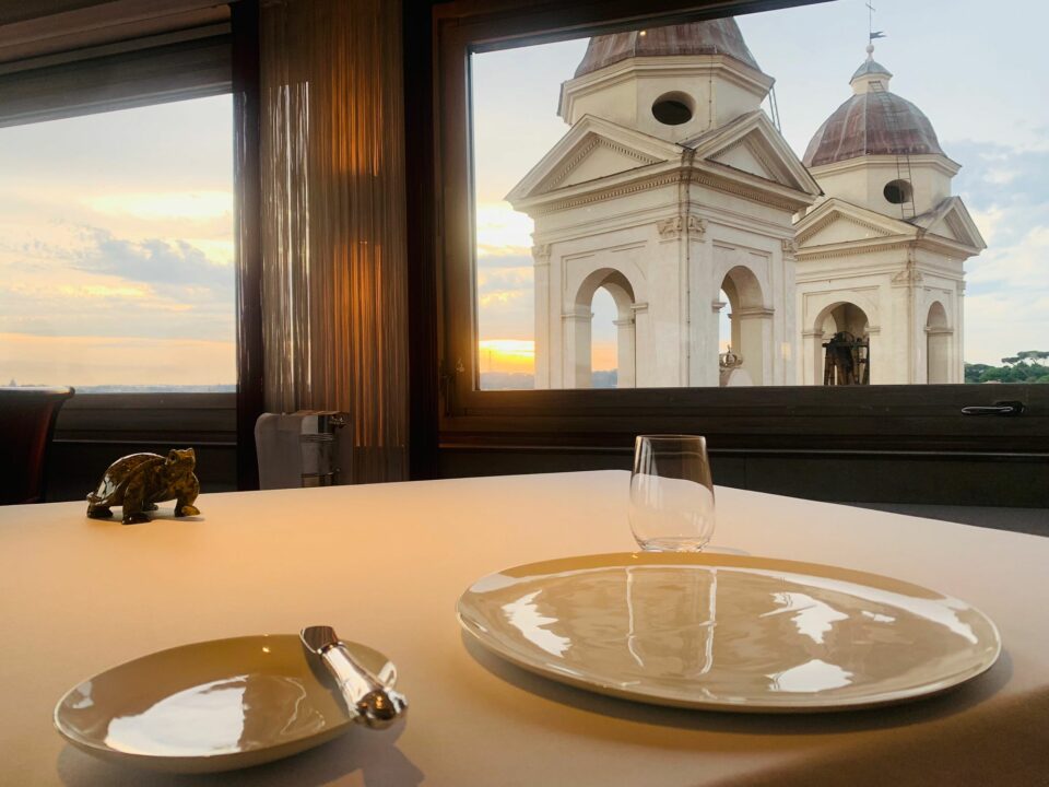 Una tovaglietta di carta sottile, che anticipa la “galleria” delle seconde portate previste dal percorso degustazione, posata con grande savoir-faire e ironia sulla tavola di un prestigioso ristorante stellato Michelin che, dalla sua posizione privilegiata, osserva fiero la distesa di Cupole e Campanili di Roma immensa.