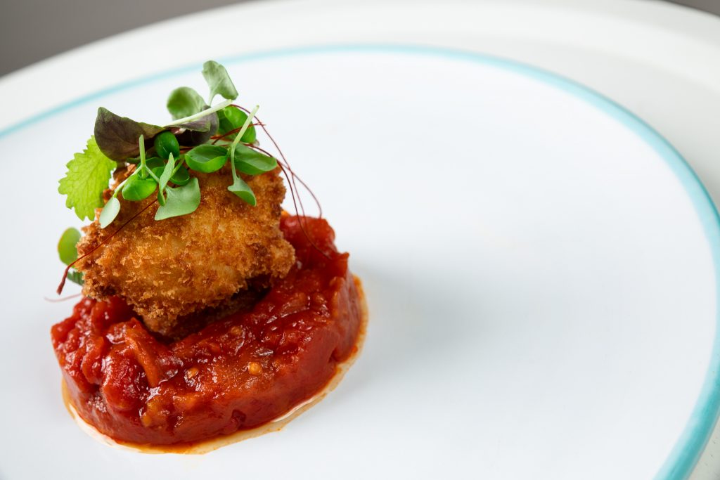 Uovo biologico, cotto a bassa temperatura fino alla sua pastorizzazione. Un uovo sicuro e senza rischi, dalla consistenza interna ancora fondente. Impanato, fritto e servito, come da manuale, con una ‘zuppetta’ di pomodoro datterino, cipolla, basilico e peperoncino. Il piatto di casa, di tutte le case dei bambini campani, fare ‘la scarpetta’ qui diventa parte della degustazione.