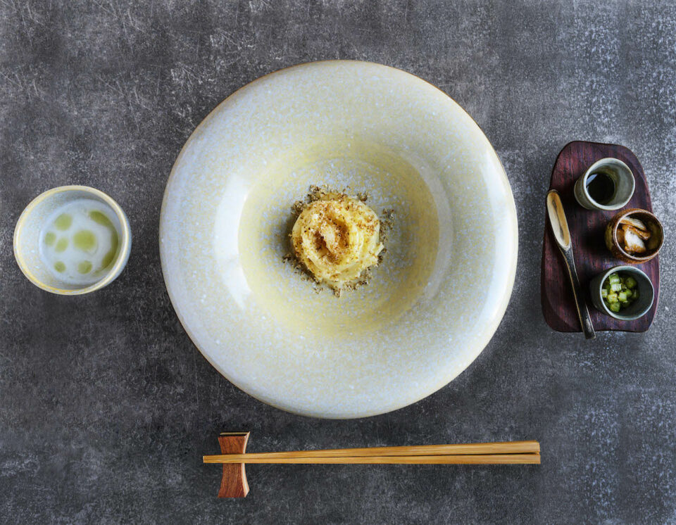 Omaggio all’italianità con una nuova versione dello Spaghetto Benedetto Cavalieri, eccellenza di Puglia. L’interpretazione dell’ingrediente pugliese si trova negli Spaghetti alla tsukemen con pollo e polpo. Nella ciotola, lo Spaghetto aglio e olio alla tsukemen con polpo bushi, brodo di pollo e olio all’alga kombu, pelle di pollo con tentacoli di polpo e bergamotto-kosho, olio di ginepro e pepe rosa, infuso freddo al tè Genmaicha e verbena. Il mix lo fa il cliente, per divertirsi a dosare a seconda dei suoi gusti.