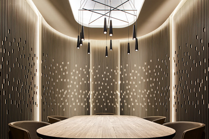 Un design che ricorda la natura orientale con maestose canne di bambu in entrata, pietra, legno, ferro e luci che ammiccano a Madre Natura per i con giochi ottici eleganti e moderni, tra vetrate- cascate e pavimenti che disegnano giardini giapponesi, giochi di onde alle pareti e un arredamento che si tinge di grigio, marrone e nero. Un gioco suggestivo di specchi e luci, le perfette simmetrie della scala centrale sono gli elementi che accompagnano i clienti dal piano superiore all’inferiore, dove è possibile cenare seduti ai due ampi tavoli tatami, secondo i dettami della più autentica tradizione giapponese.