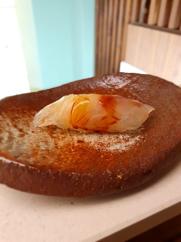 La degustazione inizia sempre con un calice di sake. Noi abbiamo provato il Dassai 45 Jinmai Daiginjo Sake servito con maestria da Sabrina Bai, proprietaria di Kohaku e sommelier di sake. Il percorso continua poi con Sakizuke, un piatto a base di tofu di fagioli fatto in casa che abbiamo mangiato accompagnato da uova di salmone, wasabi e alga nori in brodo, e con O-Suimono, una piccola scodella contenente una polpetta di gamberi con fagioli, rapa bianca, carota, scorza di yuzu e brodo di katsuodashi.