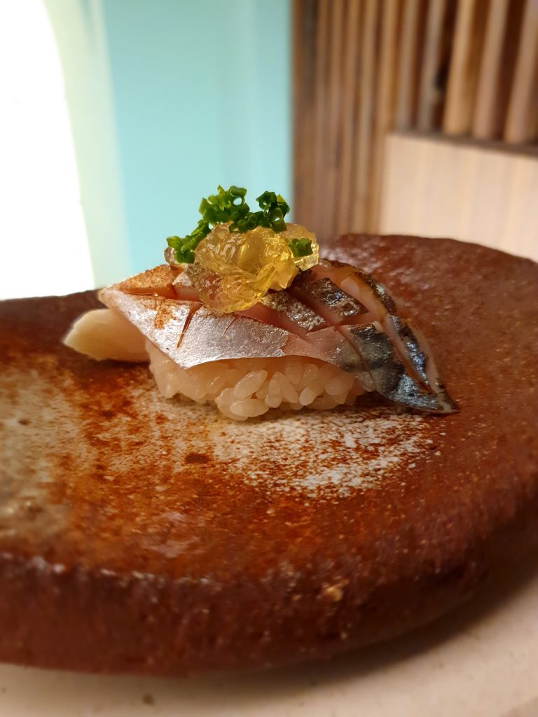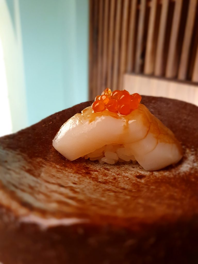 Cinque i nigiri proposti nel corso della degustazione. Noi abbiamo provato quello di spigola kobujime, cioè marinato in due fogli di alga kombu, di sgombro, mazzancolla, capasanta con uova di salmone, e chu-toro cioè la parte della ventresca di tonno più magra e fibrosa.