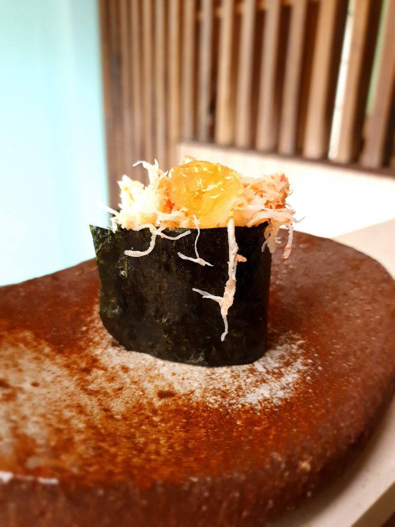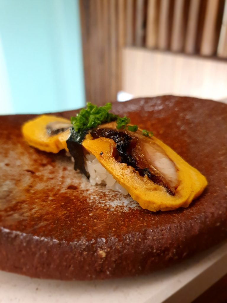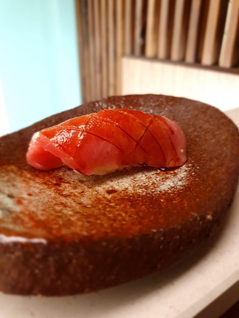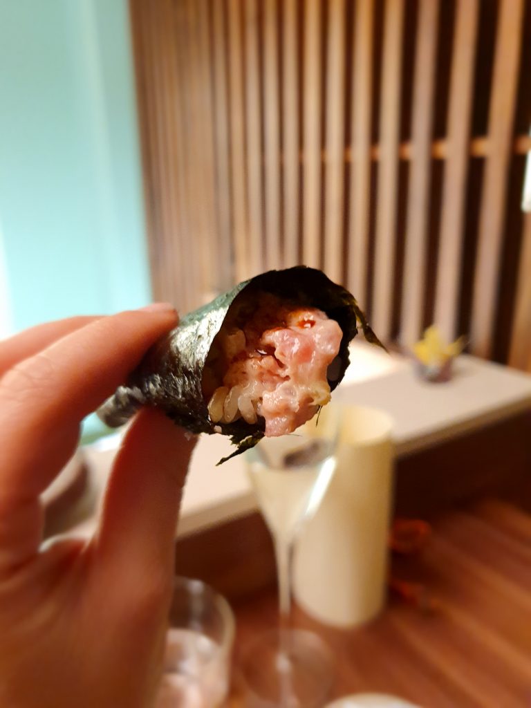 Nell’alternanza tra caldo e freddo, siamo ritornati poi al sushi con il gunkan di granchio, il nigiri di o-toro (ventresca di tonno nella sua parte più grassa e pregiata) e l’ottimo nigiri con bottarga di muggine e uova di pesce.