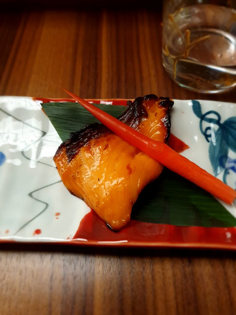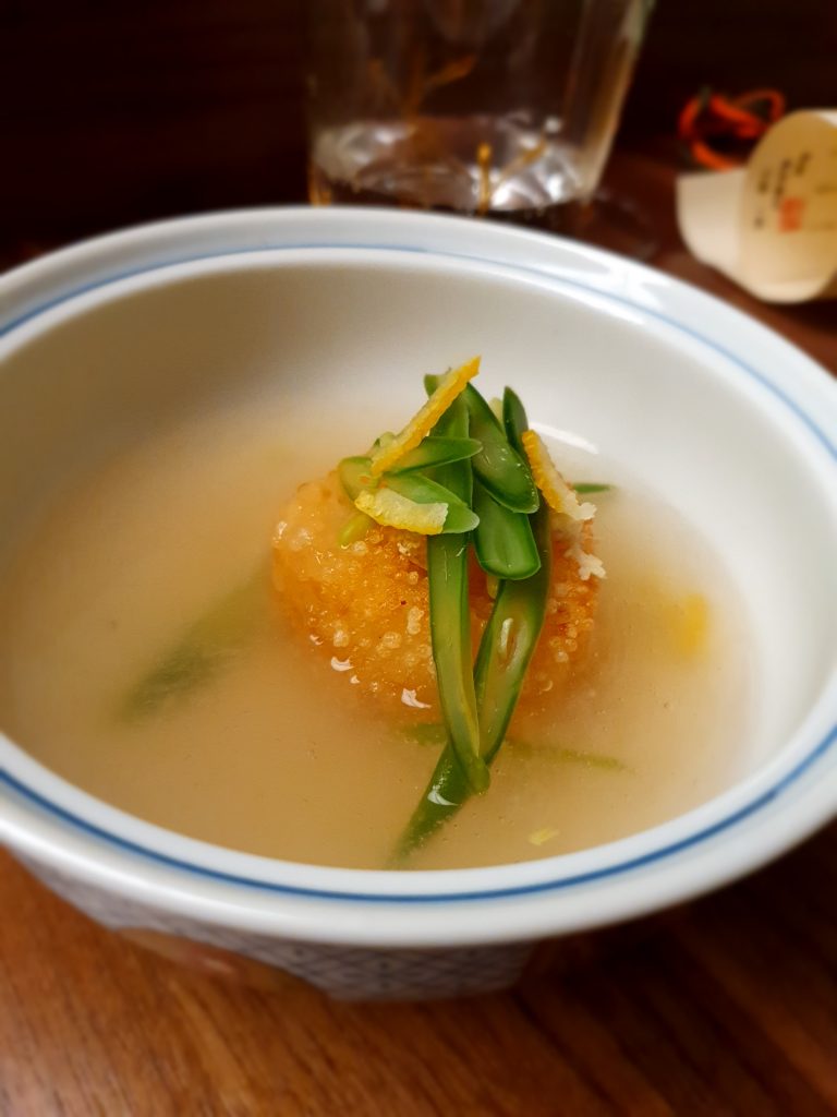 Dopo il crudo, la degustazione torna sulle pietanze cotte con lo Yakimono. Si tratta di una fetta di salmone marinato alla saikyoyaki che abbiamo provato con una sfiziosa bacchetta di zenzero da mordere per ripulire il palato. A questo è seguita Takiawase, una polpetta di patate giapponesi con mazzancolla, fagioli, kumquat, scorza di yuzu e zenzero in brodo.